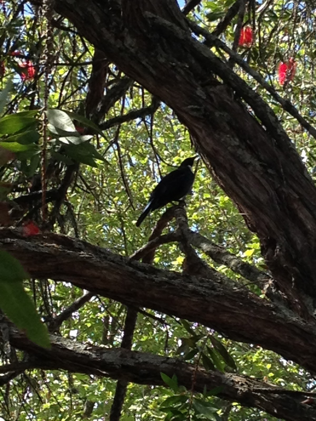 At morning tea time Katelyn noticed a tui on the bottle brush tree. Mathew wondered if that is where the tui had his nest.